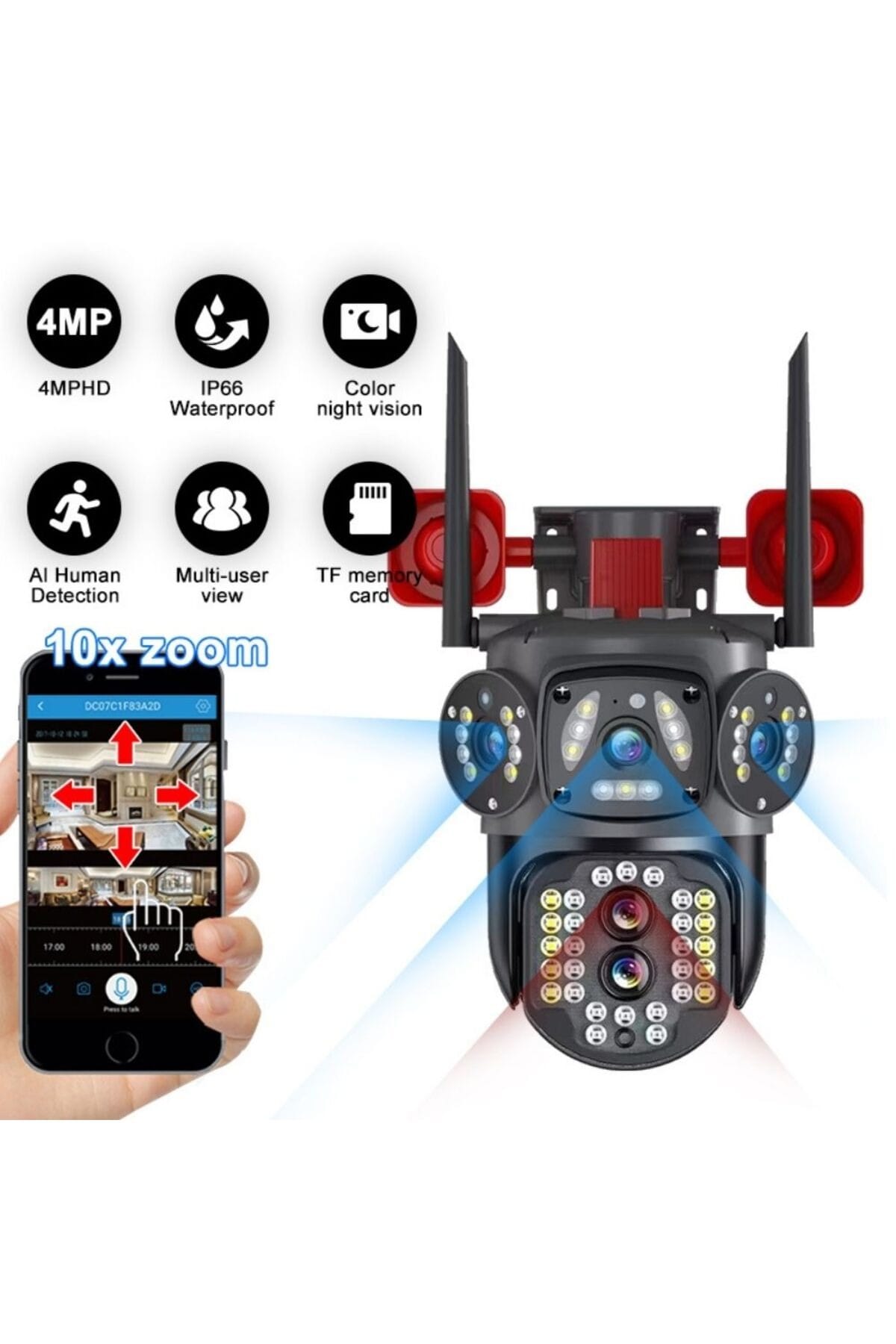 4MP 2 Kameralı PTZ Wifi Hoparlörlü 10X Optik Zoomlu Kamera Uygulama: V380 Pro, H265, Bulut Kayıt, AP Modu, Çift Yo¨nlu¨ Ses, Sesli Alarm, Fotoğraflı bildirim, IP66 Koruma Sınıfı, 16+12 adet Led, Hareket Algılama, Hareket Takibi, Gece Renkli Ve Kızılo¨tesi (Siyah Beyaz) Gece Go¨ru¨şu¨, RJ45 LAN Port, 128GB SD Kart Desteği, Çalışma Koşulları: -10?~+50?, 3.5Inch