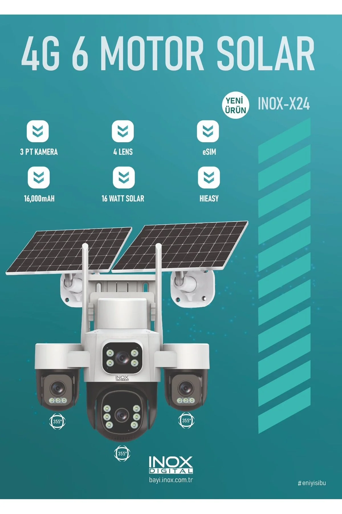 INOX X24 4 lensli 4G solar güvenlik kamerası, elektrik ve WiFi altyapısına ihtiyaç duymadan geniş alan güvenliği sağlamak için geliştirilmiş profesyonel bir güvenlik çözümüdür. Güneş enerjisi ile çalışan güçlü batarya sistemi, yapay zeka destekli hareket algılama teknolojisi ve uzaktan kontrol edilebilen hareketli kamera sistemi sayesinde tarla, bağ, bahçe, şantiye, depo ve villa gibi alanlarda kesintisiz güvenlik sağlar.